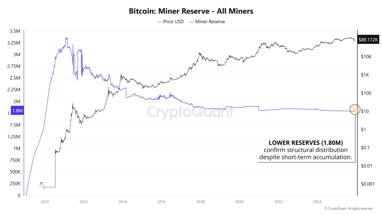 Miner data presents a clear divergence between short-term and long-term trends. Miner reserves have declined to roughly 1.80 million BTC, a level that confirms ongoing structural distribution when viewed historically. This suggests miners continue to release Bitcoin into the market over time.