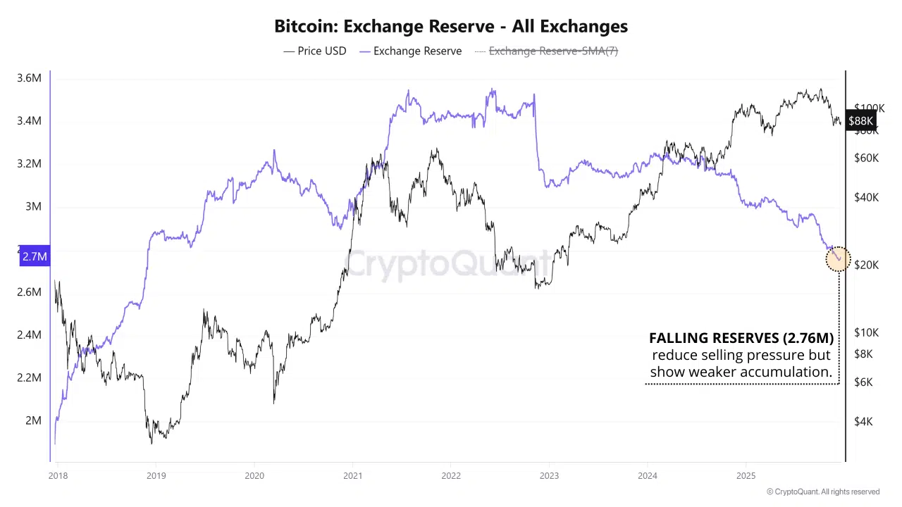 Bitcoin exchange reserves continue to trend lower, with total balances falling to approximately 2.76 million BTC. This decline reduces immediate structural selling pressure, as fewer coins are readily available on trading venues. However, the flow data paints a more nuanced picture.
