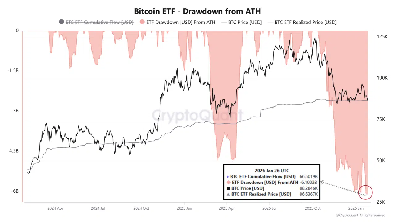 A sustained move below $86,600 would place the average ETF investor into unrealized loss. Historically, this increases sensitivity to downside and can shift flows from gradual outflows into more aggressive redemptions, amplifying pressure independent of broader market structure.