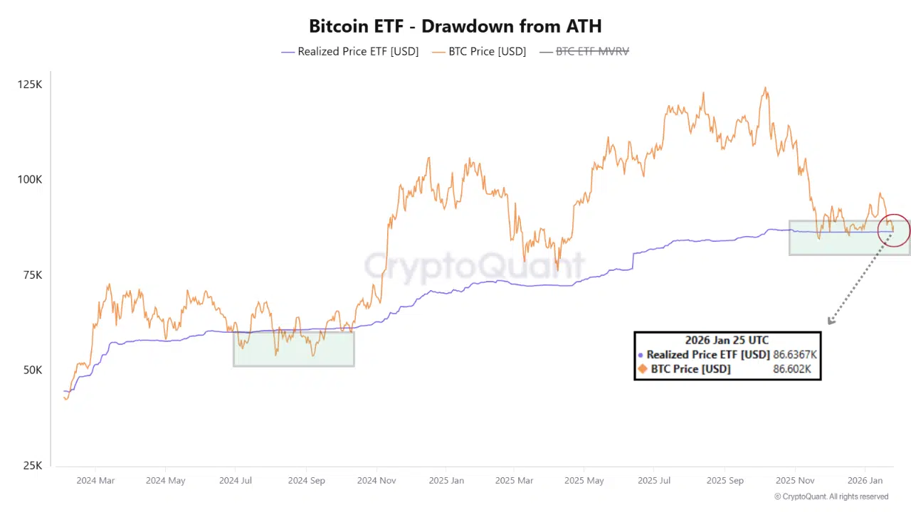 Bitcoin is trading near $87,000, a level that aligns almost precisely with the realized price of Bitcoin ETF holders at roughly $86,600, according to a report shared by CryptoQuant.