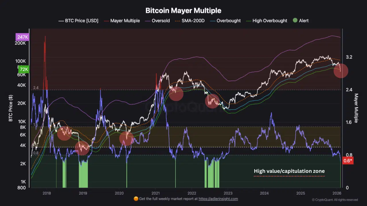 Bitcoin is now trading at one of its deepest statistical discounts to trend on record. According to a CryptoQuant report, the Mayer Multiple has fallen to 0.6, meaning Bitcoin’s price is sitting roughly 40% below its 200-day moving average.