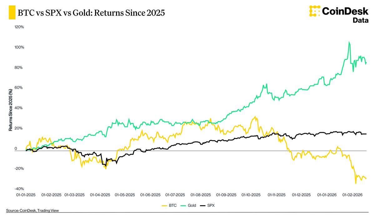 Bitcoin, however, has struggled to keep pace. Instead of acting as a consistent “digital gold” hedge during heightened geopolitical tension, BTC has delivered negative returns over the same timeframe, drifting significantly below its 2025 starting point.