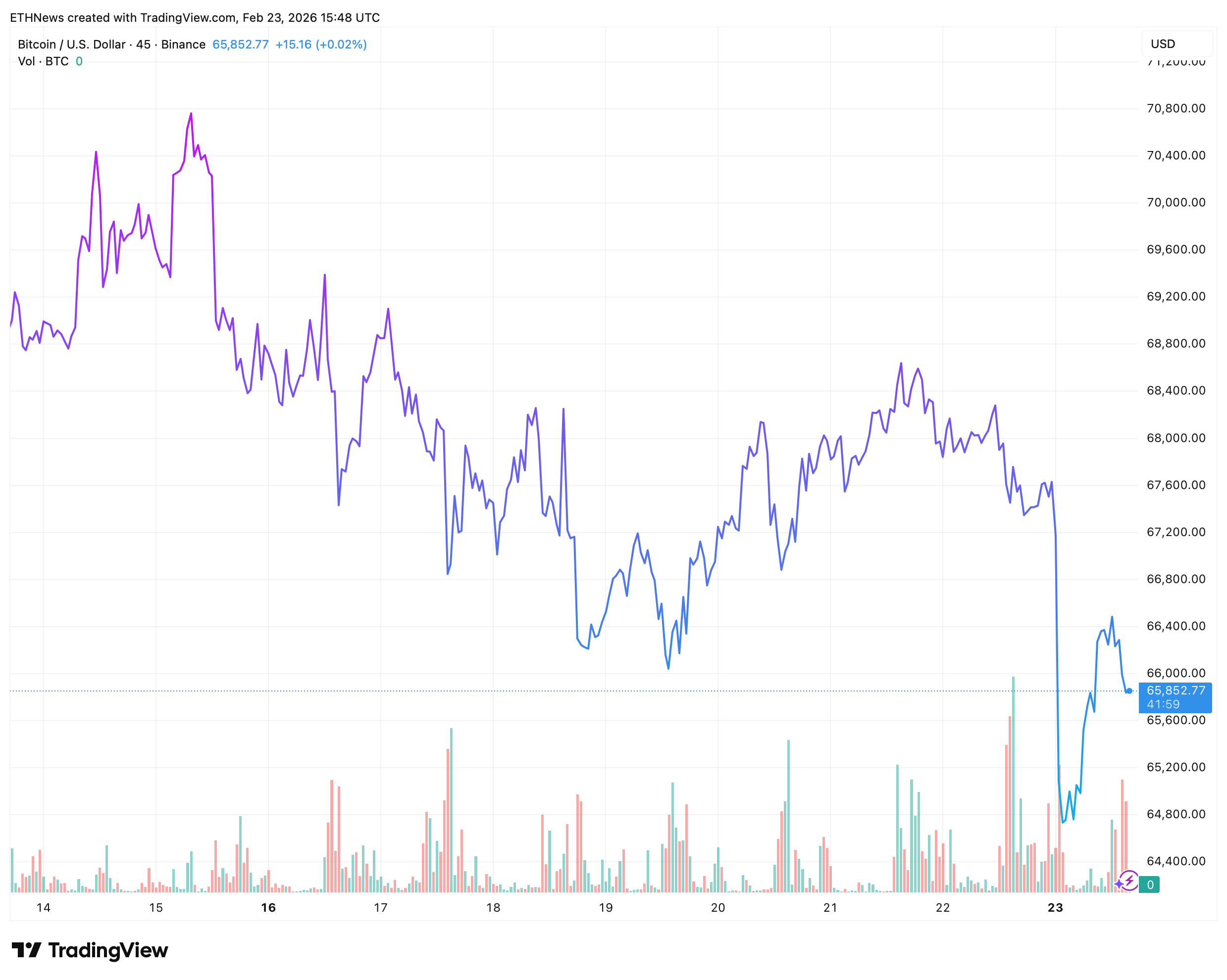 BTC/USD briefly flushed toward the mid-$65,000 region before snapping back inside structure. Price is currently hovering around $65,800, holding above the recent wick low.