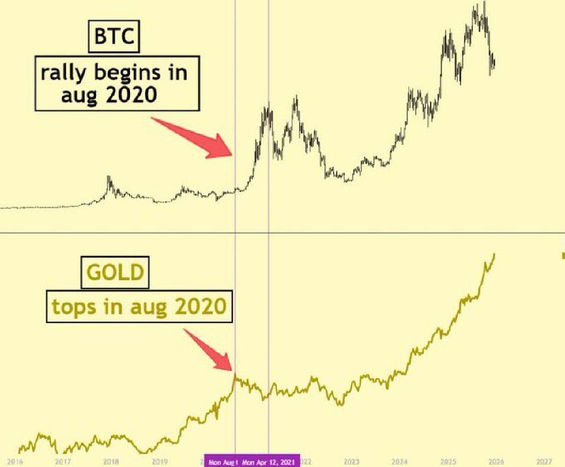 The chart highlights a striking historical alignment: gold topping in mid-2020, followed by Bitcoin entering one of its strongest expansion phases on record.