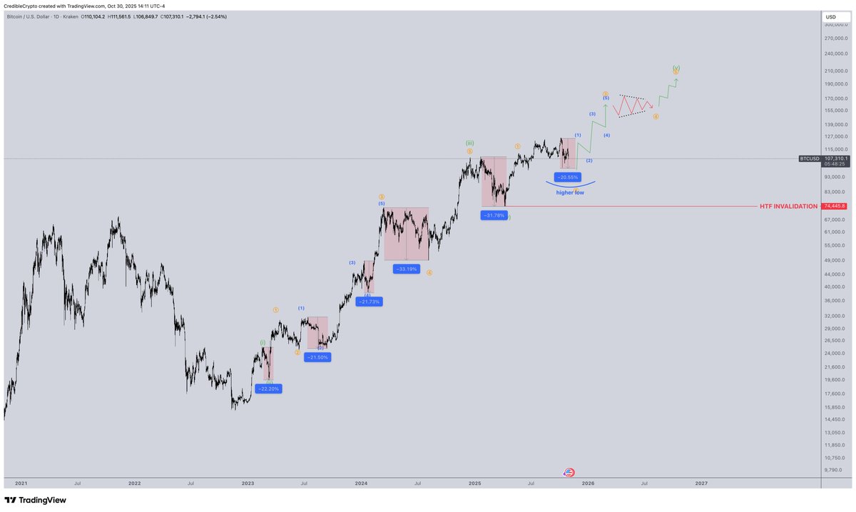 While some traders see a potential slide below $100K as a bearish signal, CrediBULL maintains that the true invalidation level for the current cycle sits much lower, around $74,000.