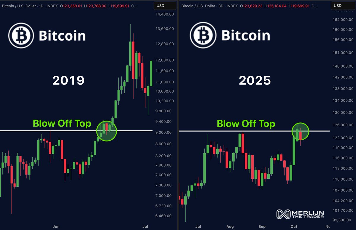 Trader Merlijn The Trader sees echoes of Bitcoin’s 2019 rally, where a supposed “blow-off top” trapped bearish traders before a 70% surge. He suggests the same setup is emerging in 2025, calling it “a different scale, same psychology.” His analysis implies that disbelief could vanish “in one candle” if the pattern repeats.