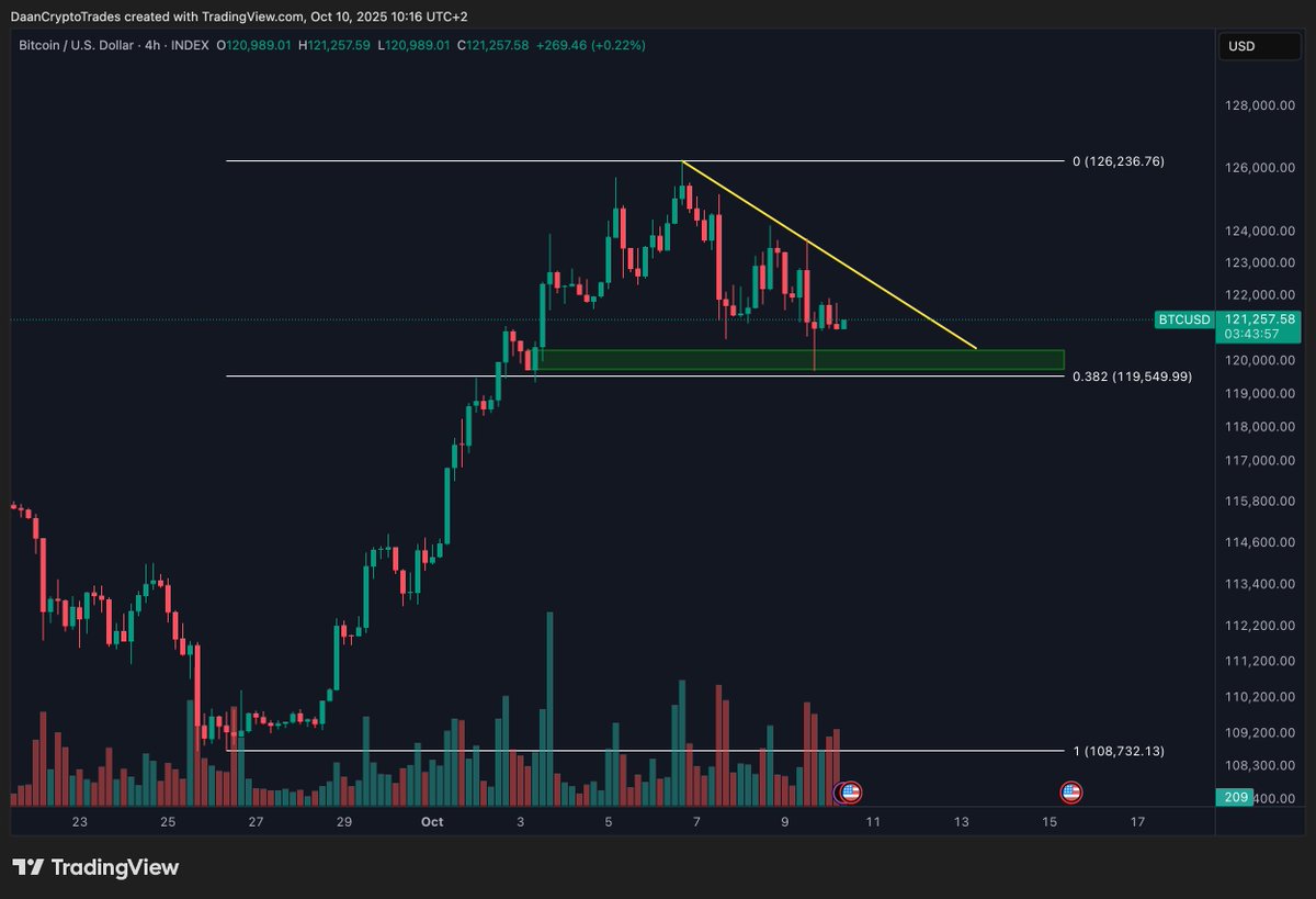 Meanwhile, Daan Crypto Trades emphasized that Bitcoin remains in an uptrend but is consolidating beneath diagonal resistance after its recent all-time high sweep. He identifies $120,000 as the key level to hold. Losing that support could send the price down to the $114,000–$115,000 range, but a breakout above resistance could trigger another leg higher.