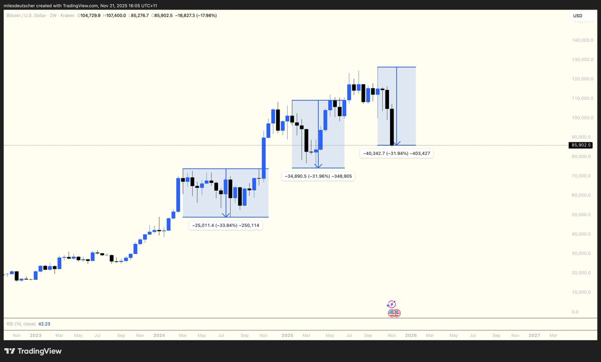 Deutscher points out that Bitcoin has already experienced multiple heavy pullbacks in this run, including a -34% drop earlier in the year and another -31% reset before the summer rally.