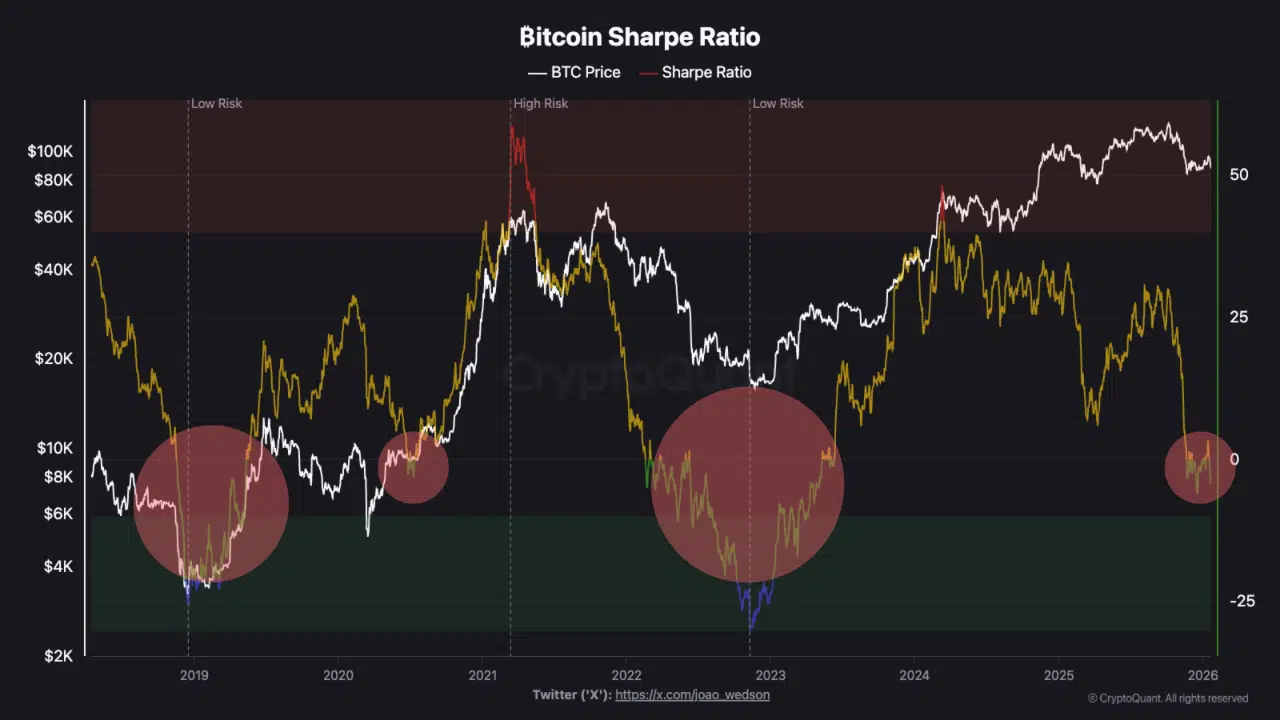 According to CryptoQuant, Bitcoin’s Sharpe Ratio has dropped into a zone that historically appears only during extreme market stress, moments when risk has already been absorbed rather than just beginning.