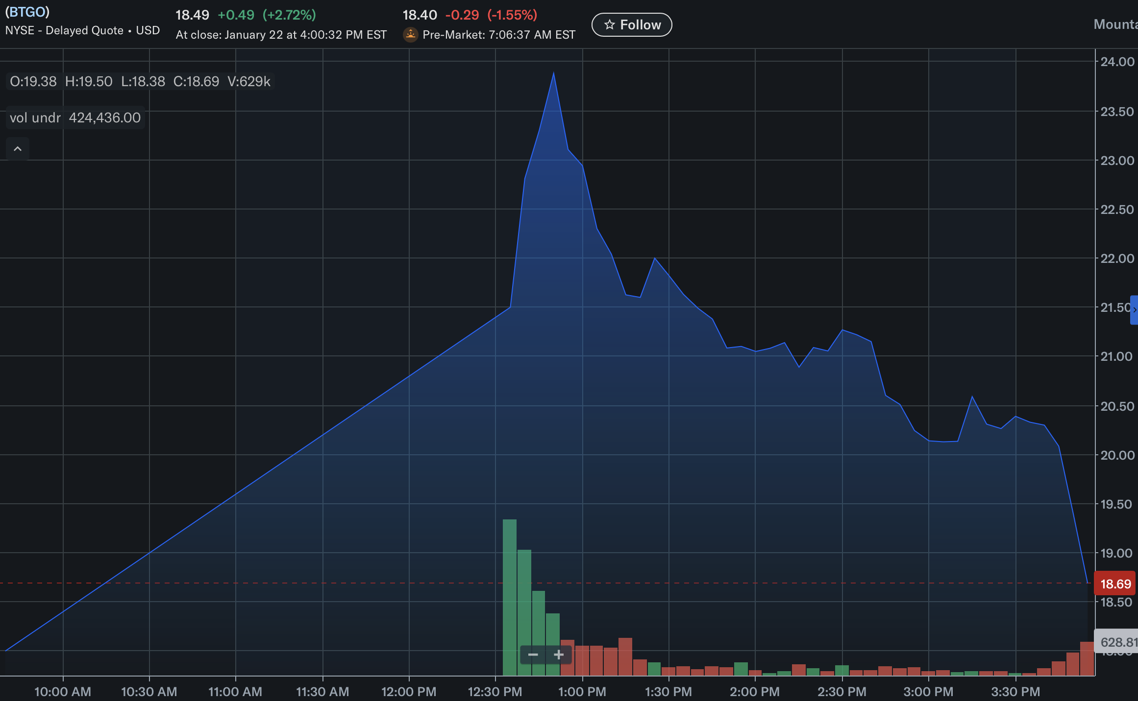 By the close, BTGO finished at $18.49, only +2.7% above the IPO price, erasing the majority of its intraday gains.