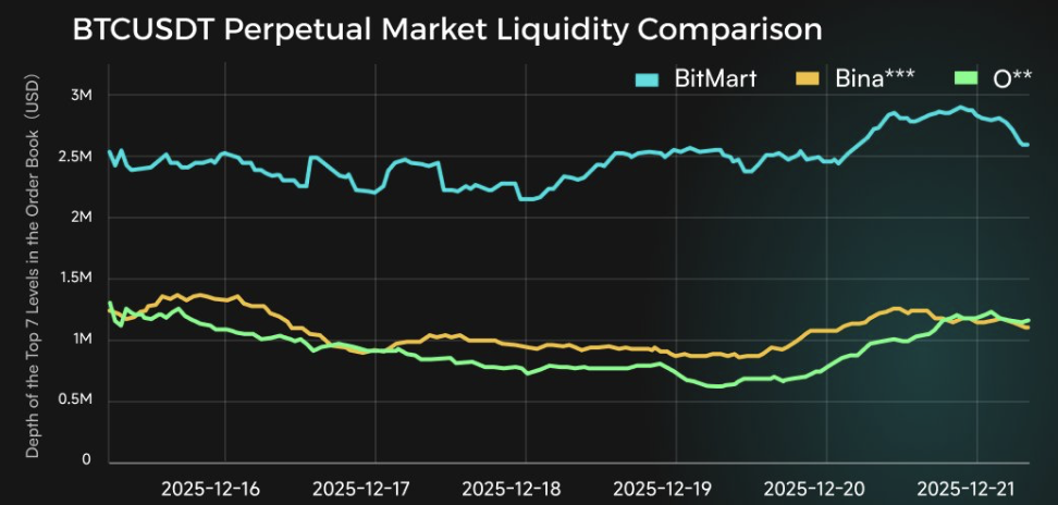 The BTCUSDT perpetual liquidity chart tracks the depth of the top seven order book levels, measured in USD. Throughout the timeframe shown, BitMart’s liquidity line remains decisively above the others, even as broader market conditions fluctuate.