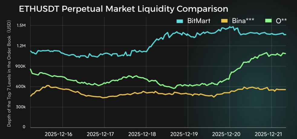 Data comparing BTCUSDT and ETHUSDT perpetual markets shows BitMart consistently maintaining deeper order books than competing global venues during the observed period.