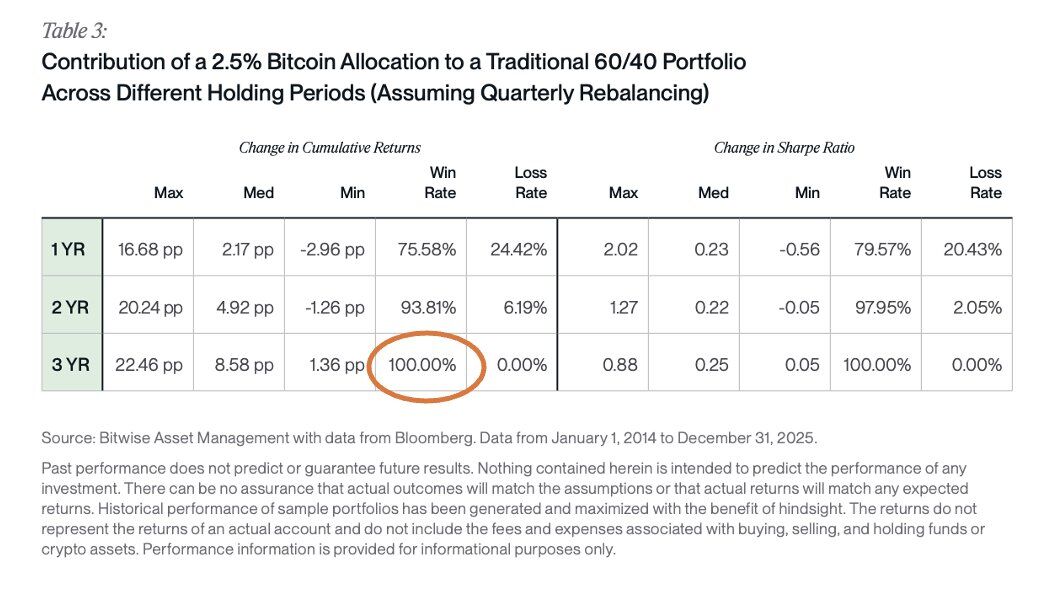 New Bitwise Asset Management study using Bloomberg data from January 2014 through December 2025 finds that a 2.5% Bitcoin allocation with quarterly rebalancing improved cumulative returns in 100% of three-year holding periods and 93.81% of two-year periods, with zero three-year loss instances recorded.