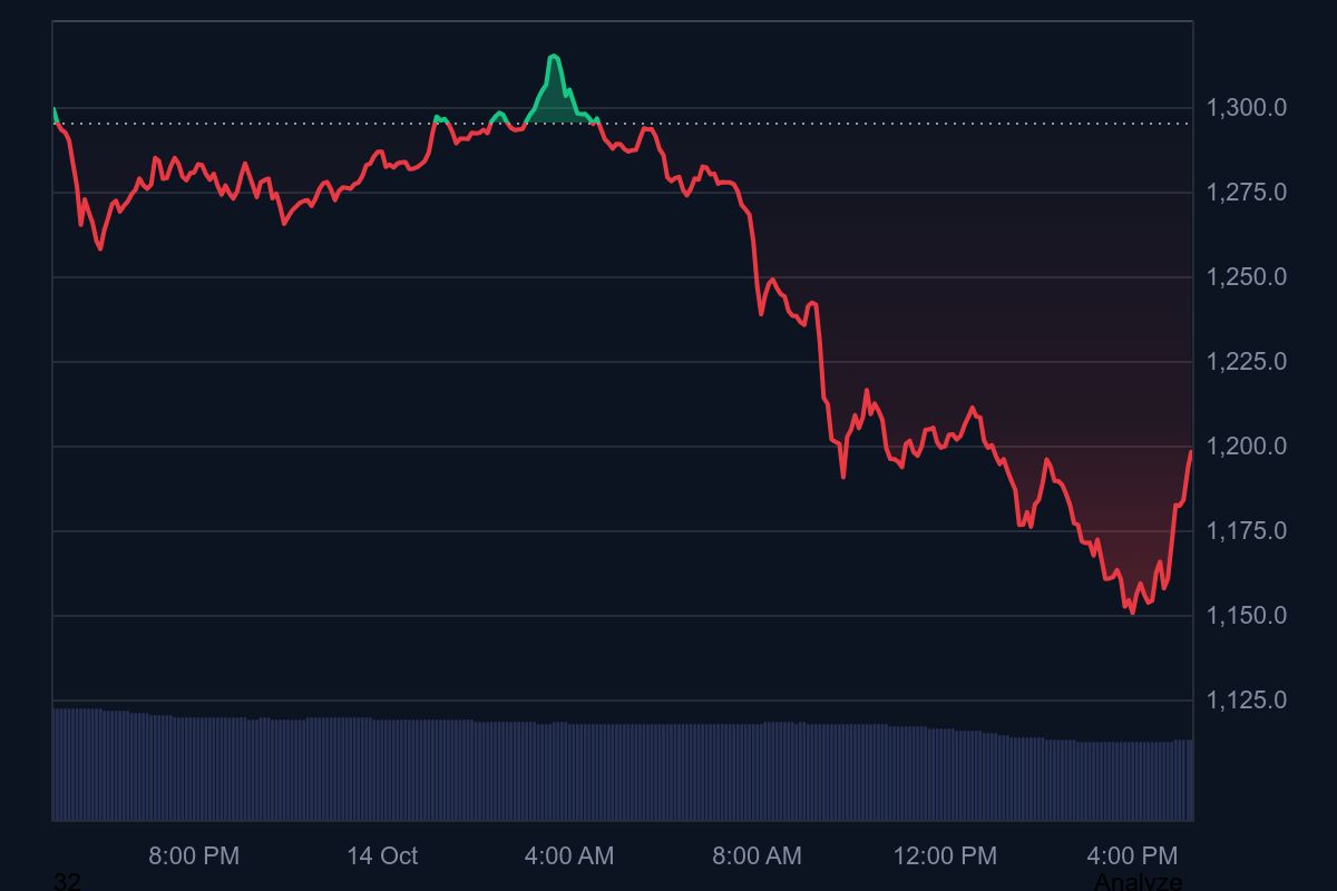 BNB’s weekly Relative Strength Index (RSI) recently hit 81, its most overbought reading since July 2024, when a similar setup triggered a 44% correction. The current structure on the 4-hour chart reveals a clear double-top formation near $1,295, with a neckline around $1,100. A decisive daily close below that zone could open the door to a deeper decline toward $1,000, a critical psychological and technical level.