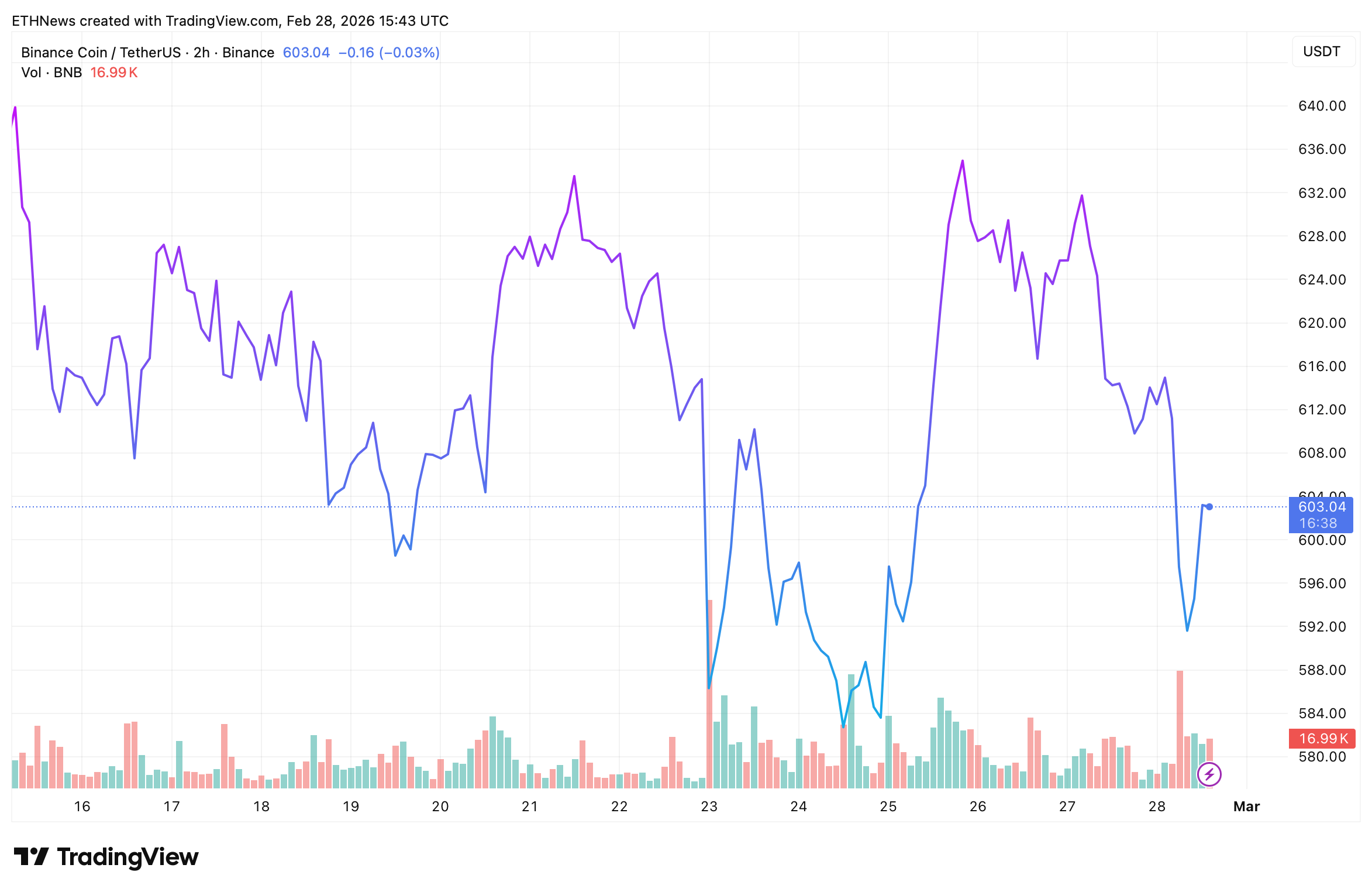 The recovery from that low carried BNB back toward the $634 area by February 25th, but the move failed to hold and price has since rolled back down to the $603 range where it currently sits. That sequence, a lower high following a lower low, is the structure that technical analysts use to define a downtrend. It has now repeated across multiple timeframes over the past two weeks.