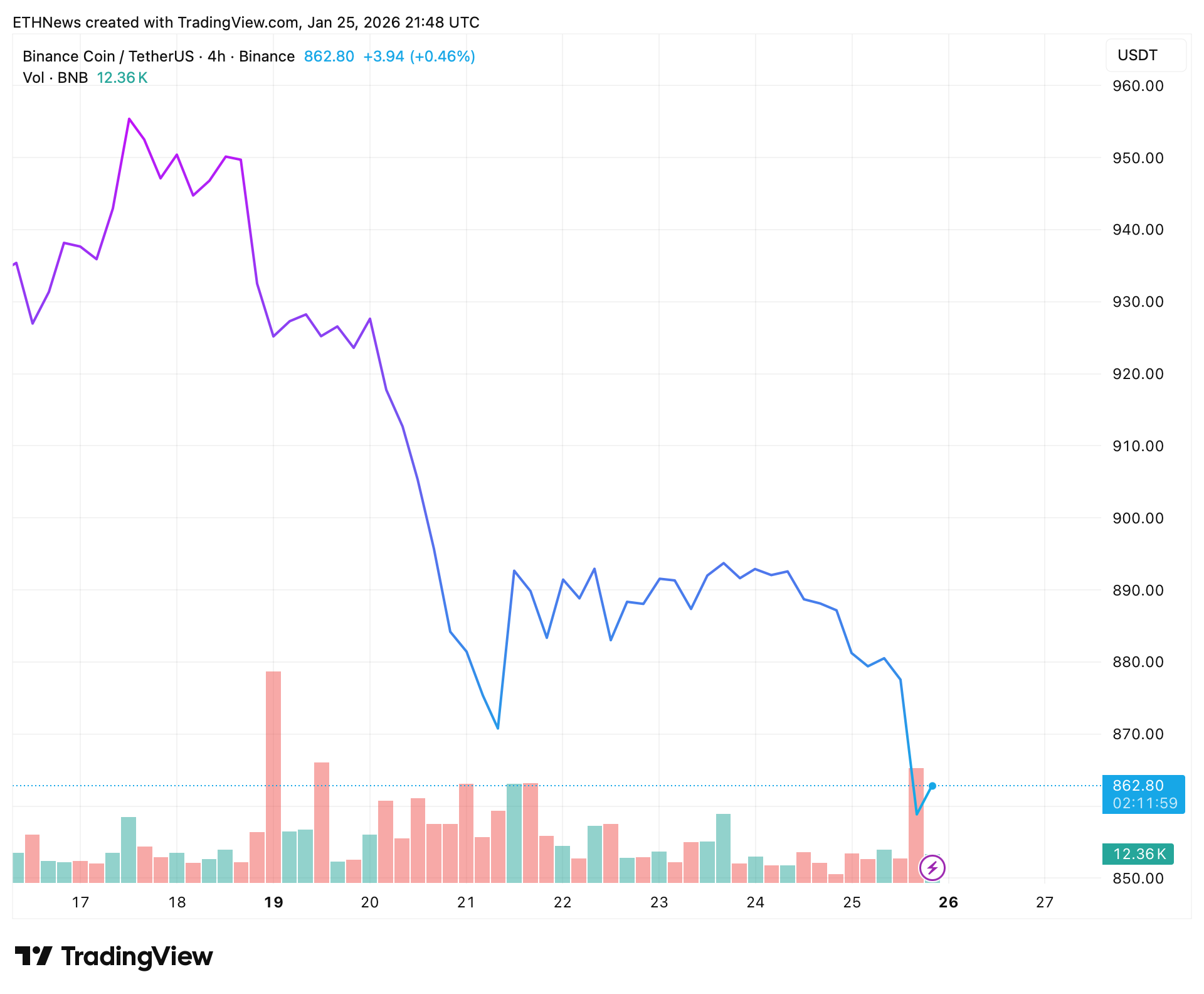Over the past day, BNB has slipped 2.7%, extending its weekly decline to roughly 9.3%. The move follows a sharp sell-off that dragged price from the mid-$900s toward the low-$860s, before buyers stepped in to slow the drop.
