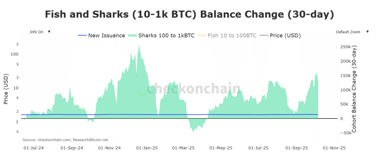 Meanwhile, larger players have stepped in, with wallets in the 100–1,000 BTC bracket adding over 10,000 coins per day in recent weeks. The “sharks” alone added 124,000 BTC on October 6, confirming that institutional demand is not slowing down.