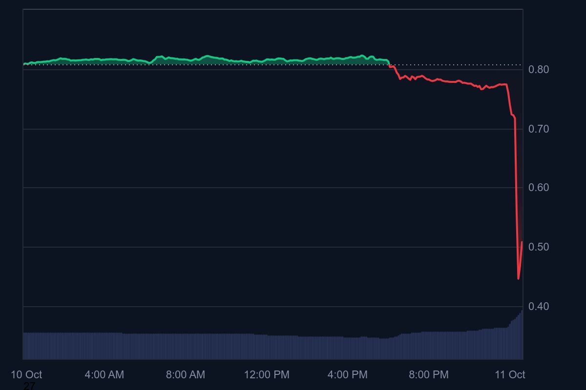 Cardano (ADA) suffered one of its sharpest single-day declines of the year, plunging 37.4% in the past 24 hours to around $0.5068 at the time of writing, according to CoinMarketCap. The collapse came as the broader crypto market reeled from heavy liquidations, with over $5 billion wiped out across exchanges and Bitcoin briefly falling below $107,000.