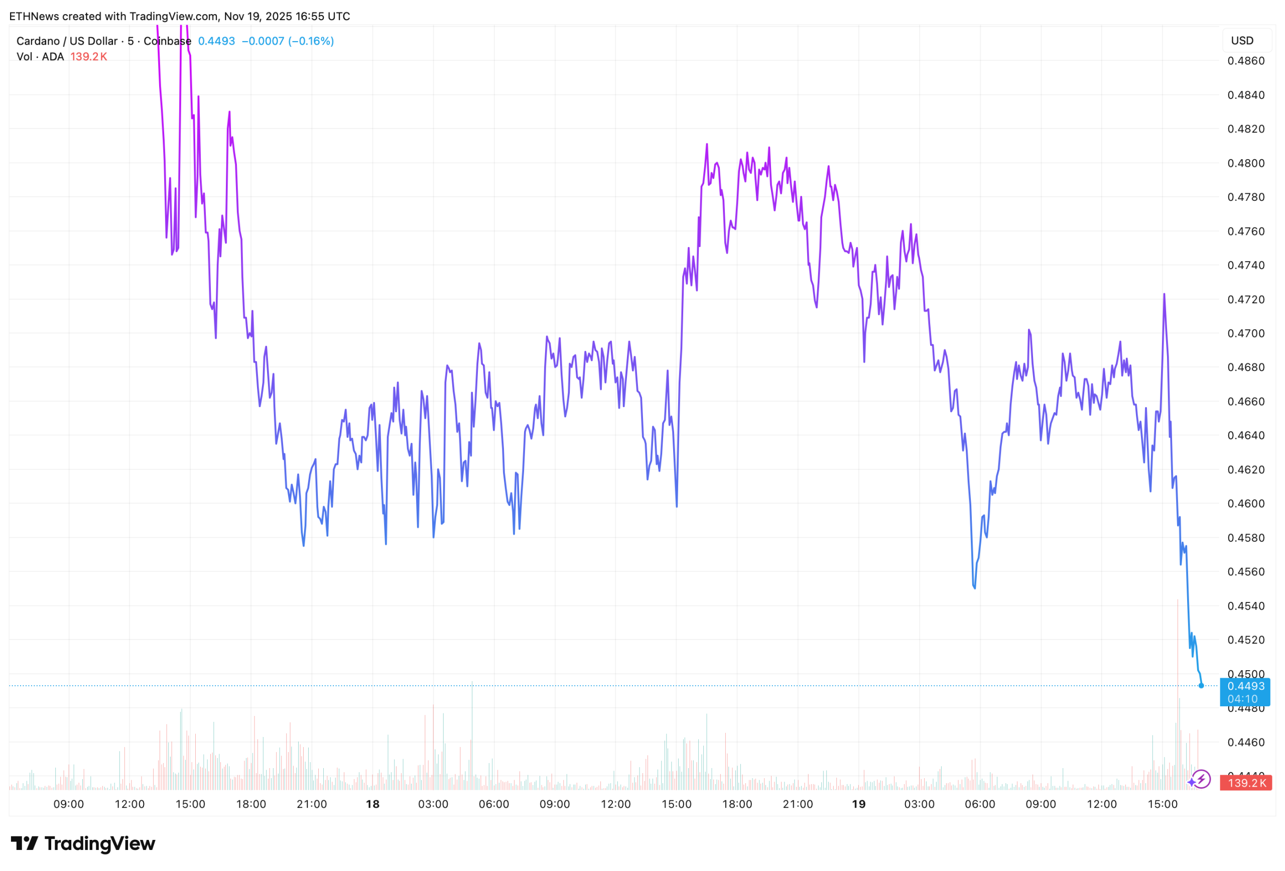 ADA has spent most of November under heavy selling pressure, sliding from above $0.60 toward the mid-$0.40 range. But the latest daily chart suggests this weakness may be reaching exhaustion.