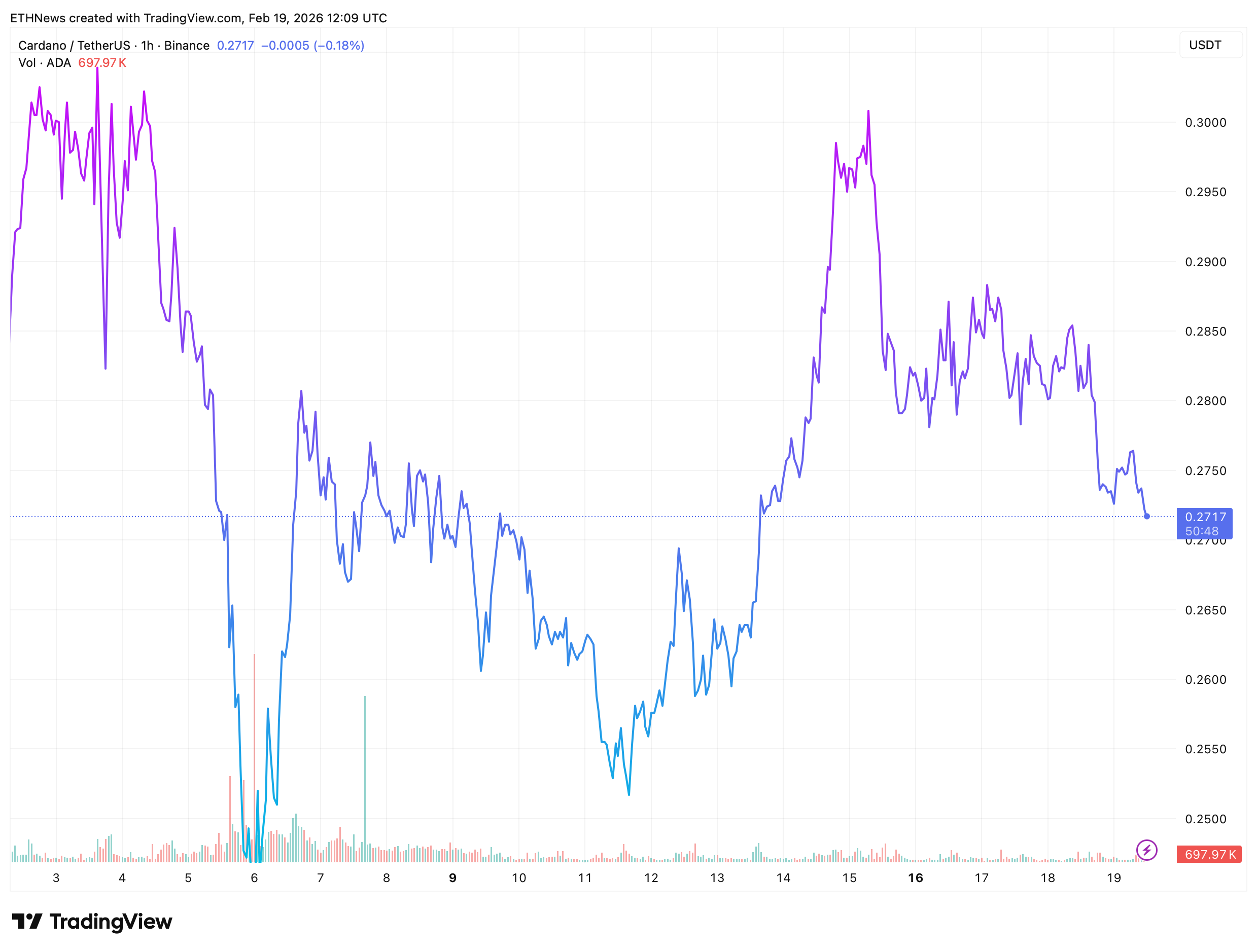 At the time of writing, ADA/USDT is trading near $0.2717 on the 1-hour Binance chart, hovering just above recent local lows.