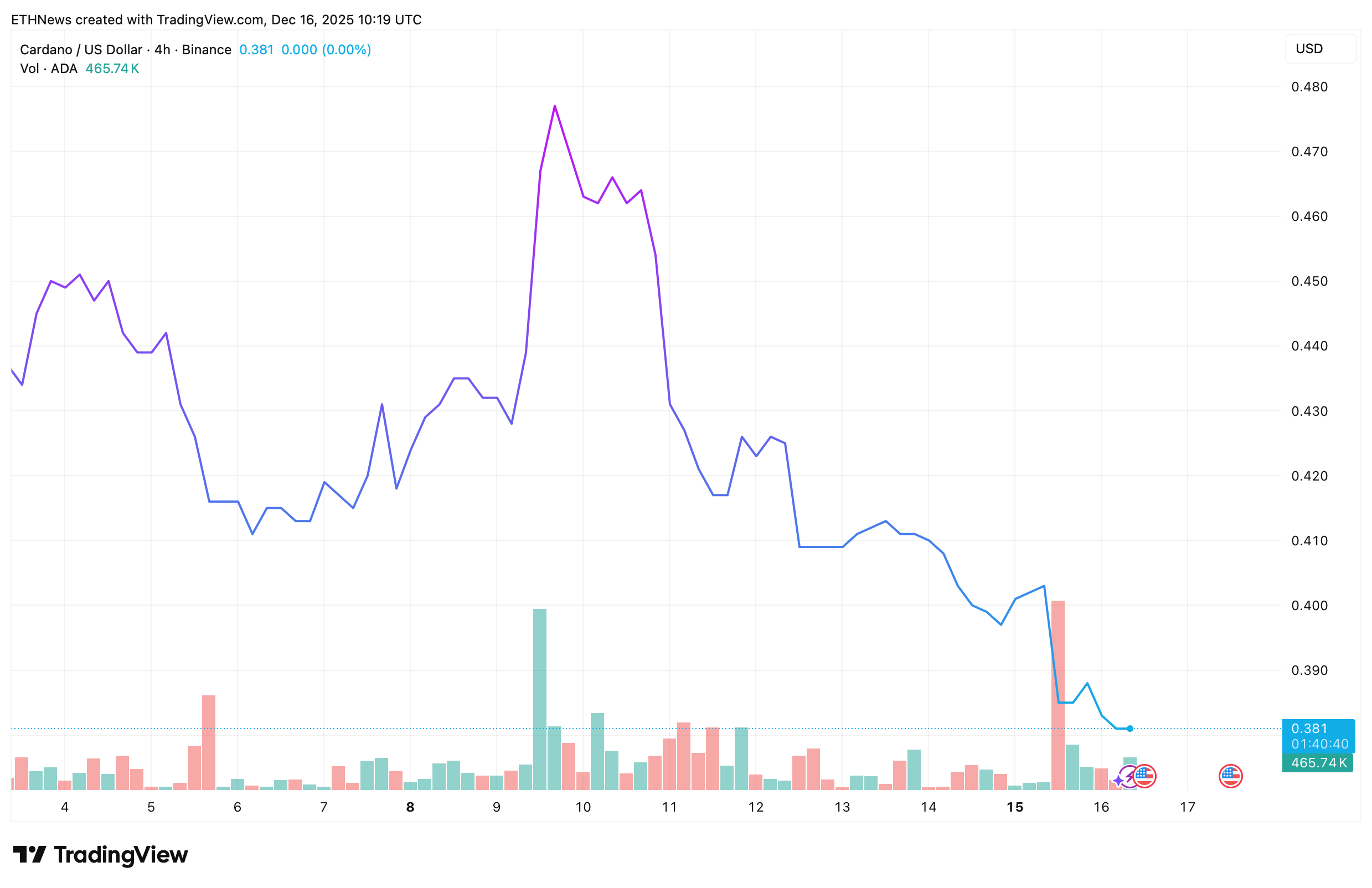 The 4-hour chart reinforces the structural damage. After peaking earlier in the month, ADA rolled over sharply and entered a steady decline. Price is currently hovering near the $0.38 area, showing limited bounce attempts and a series of lower highs.