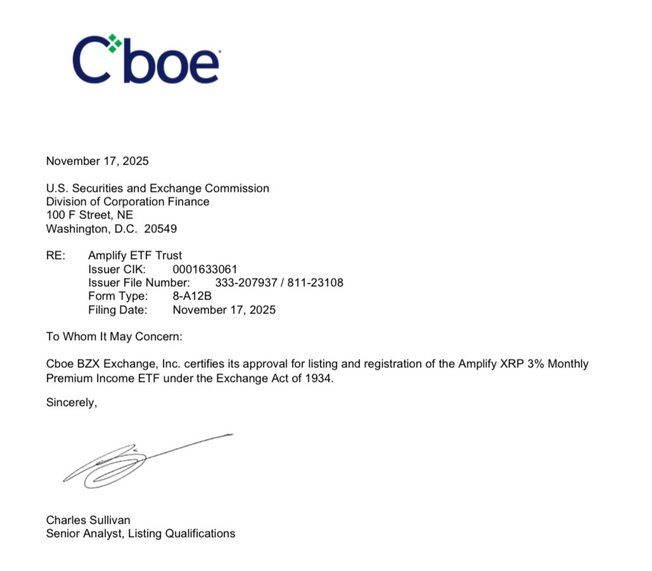 According to an official certification letter dated November 17, 2025, Cboe confirmed that the fund, filed under Form 8-A12B by Amplify ETF Trust, meets all requirements to list under the Exchange Act of 1934. The approval marks one of the most notable XRP-linked ETP developments of the year, coming just days after increased institutional interest in yield-enhanced crypto products.