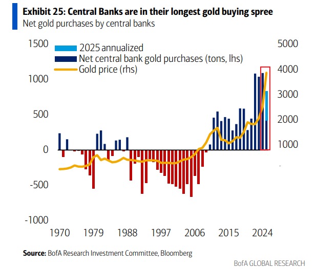The chart from BofA Global Research highlights that before 2010, central banks were net sellers of gold for over two decades. Since then, the reversal has been dramatic, with gold purchases now sustaining the longest buying streak on record.