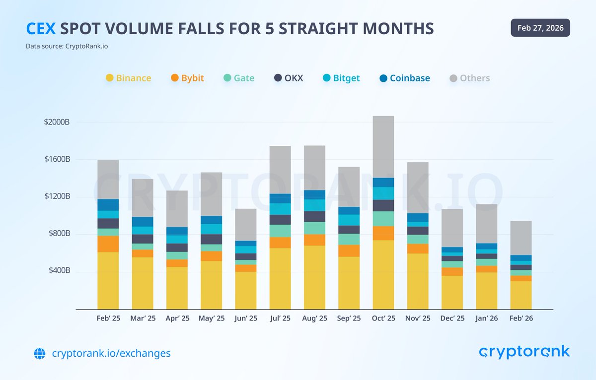 Centralized exchange spot trading volumes have declined every month since October 2025, with February 2026 data from CryptoRank showing the lowest aggregate figures recorded over the past twelve months, as activity across every major platform continues to pull back from last year’s peak.