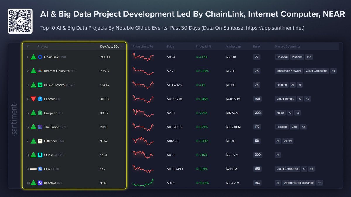 According to the latest data shared by Santiment, Chainlink, Internet Computer (ICP), and NEAR Protocol are leading the crypto sector in AI and Big Data development activity over the past 30 days.