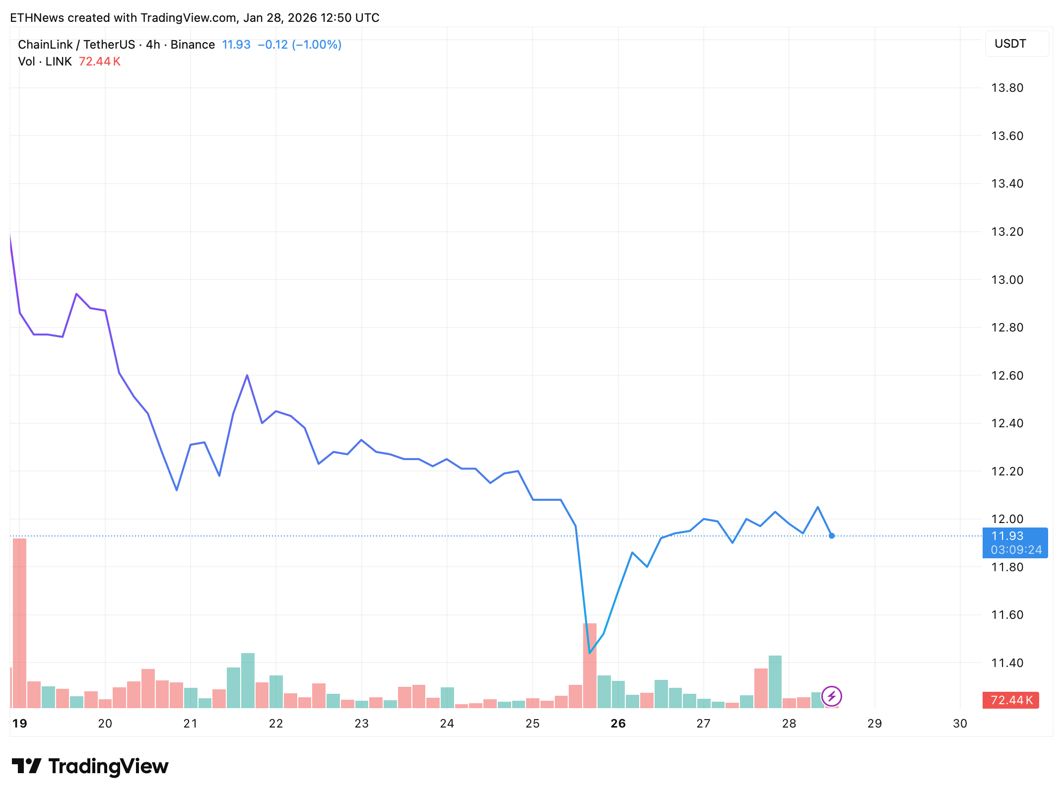 On the 4-hour chart, LINK sold off aggressively from the $12.6–$12.8 region, accelerating lower into a sharp wick down toward the $11.4–$11.5 zone. That flush was accompanied by a noticeable spike in volume, consistent with liquidation-driven selling rather than orderly distribution.
