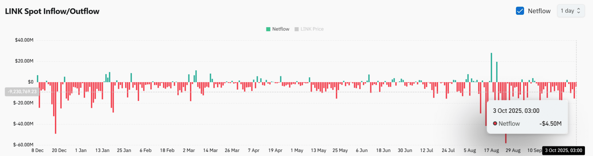 Meanwhile, on-chain activity shows a shift in how holders manage their LINK tokens. In early October, exchanges recorded $4.5 million in LINK outflows. Such movement suggests that investors are moving assets into private wallets rather than preparing to sell.