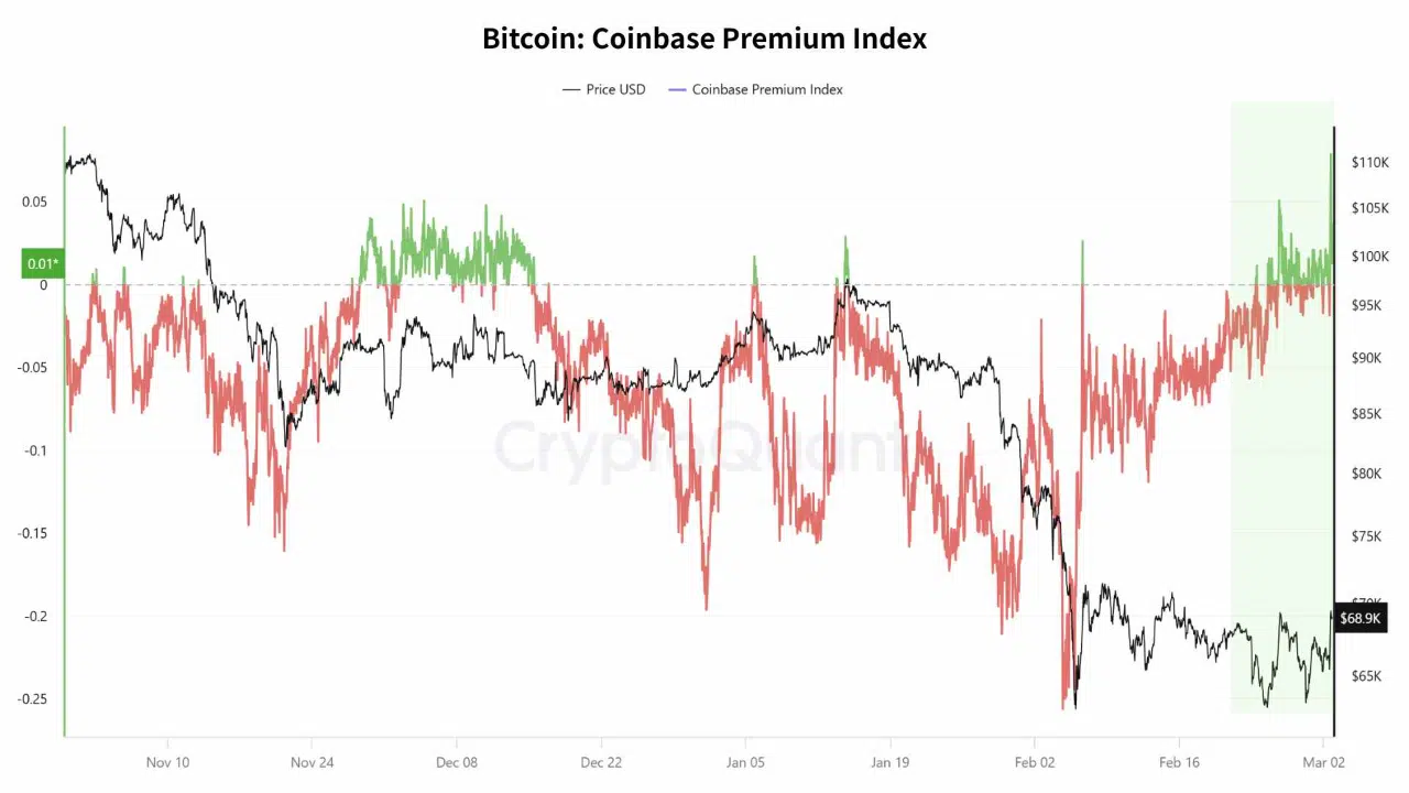 CryptoQuant’s Coinbase Premium Index has flipped into positive territory as of early March 2026, signaling that US-based buyers are paying a premium for Bitcoin on Coinbase relative to other exchanges for the first time since mid-January.