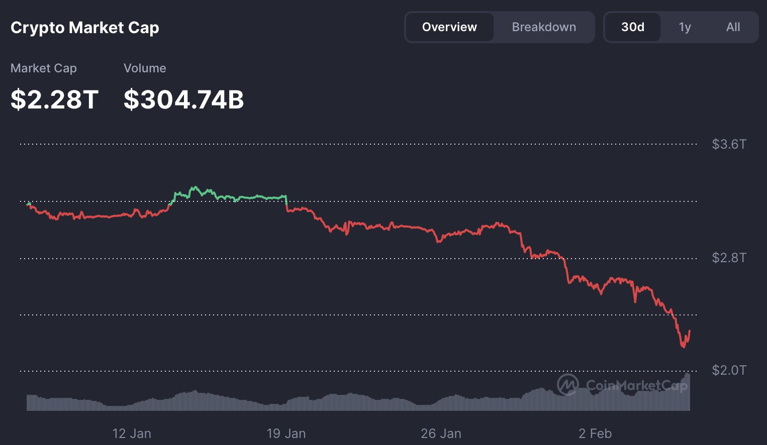 If total market capitalization can hold near $2.28 trillion and sentiment stops deteriorating further, the current extreme fear reading may begin functioning as a contrarian signal. That would require acceptance above current levels and a gradual improvement in breadth indicators.