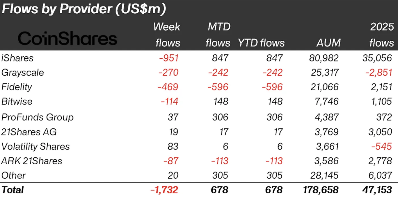 From a provider perspective, the data highlights sustained pressure on the largest issuers. iShares recorded $951 millionin weekly outflows, while Grayscale and Fidelity saw withdrawals of $270 million and $469 million, respectively. These redemptions outweighed modest inflows into smaller providers and volatility-focused products, leaving total weekly flows deeply negative.