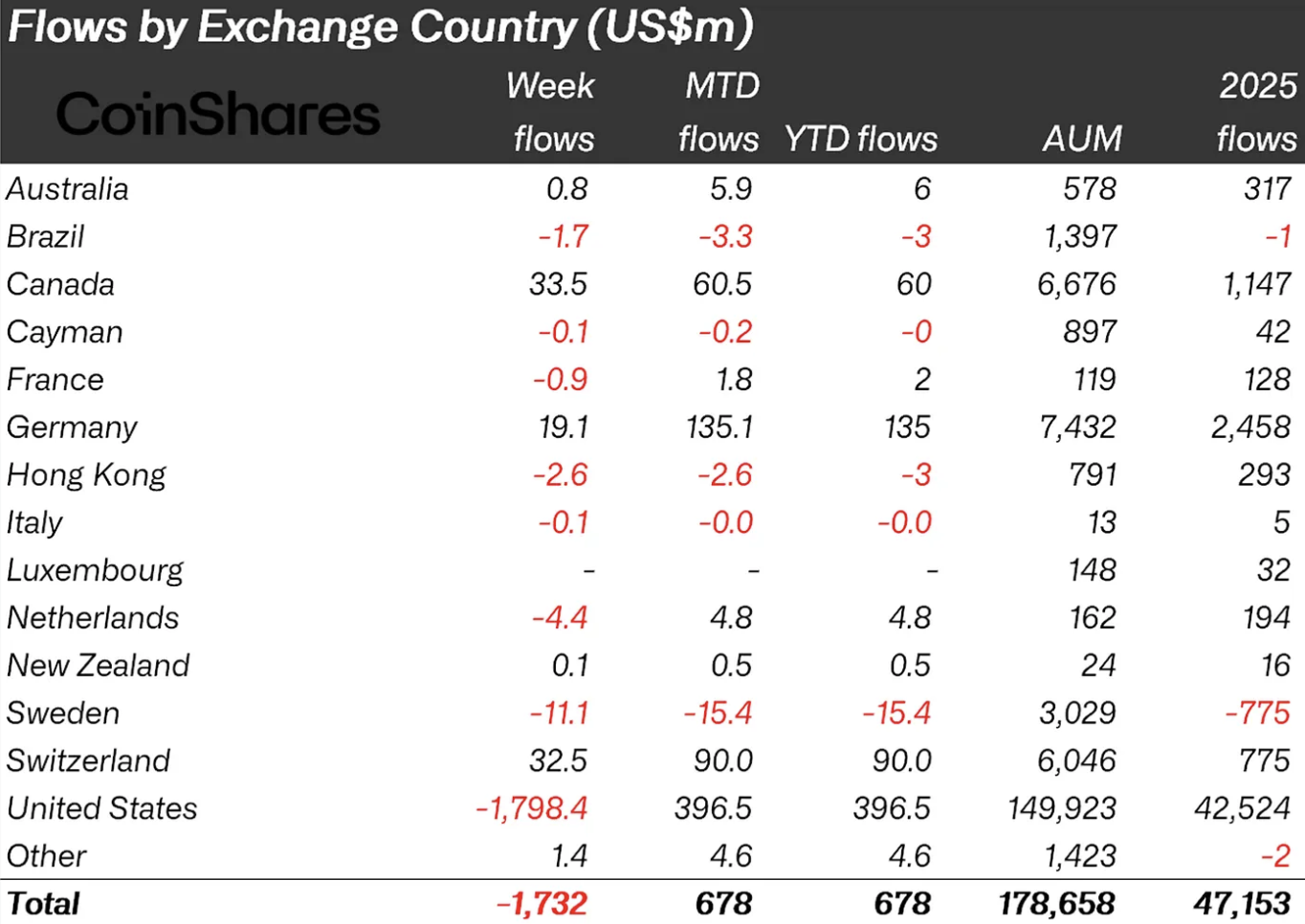 The outflows were overwhelmingly concentrated in the United States, which accounted for nearly $1.8 billion in weekly withdrawals. This contrasts sharply with parts of Europe and Canada, where investors used the price pullback to add exposure. Switzerland ($32.5 million), Germany ($19.1 million), and Canada ($33.5 million) all posted notable inflows over the same period.