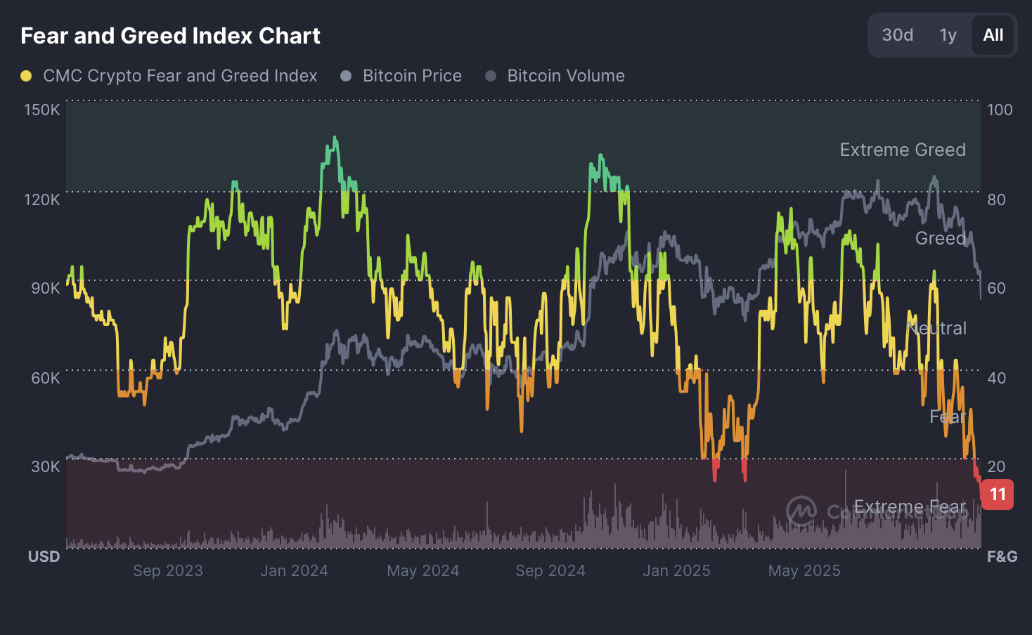 The Fear & Greed Index has collapsed to 11, deep in “extreme fear”, a psychological level often associated with capitulation phases. Meanwhile, Altcoin Season Index at 26 confirms capital is fleeing speculative assets and rotating defensively toward Bitcoin, despite BTC’s own sharp correction.