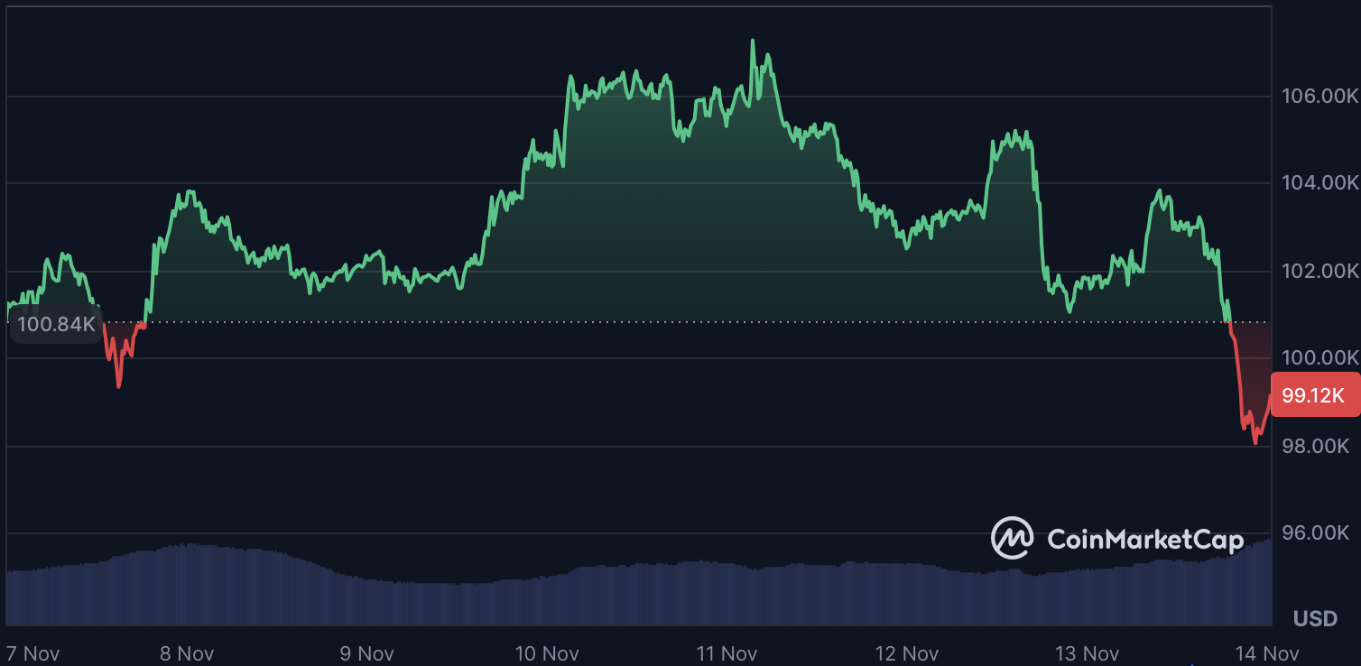 The cryptocurrency market fell sharply as a sudden liquidity crunch rippled across major exchanges and triggered widespread leveraged liquidations. Bitcoin, which had spent months trading comfortably above six figures, slid decisively below the $100,000 mark, dragging the broader market into deep red territory.
