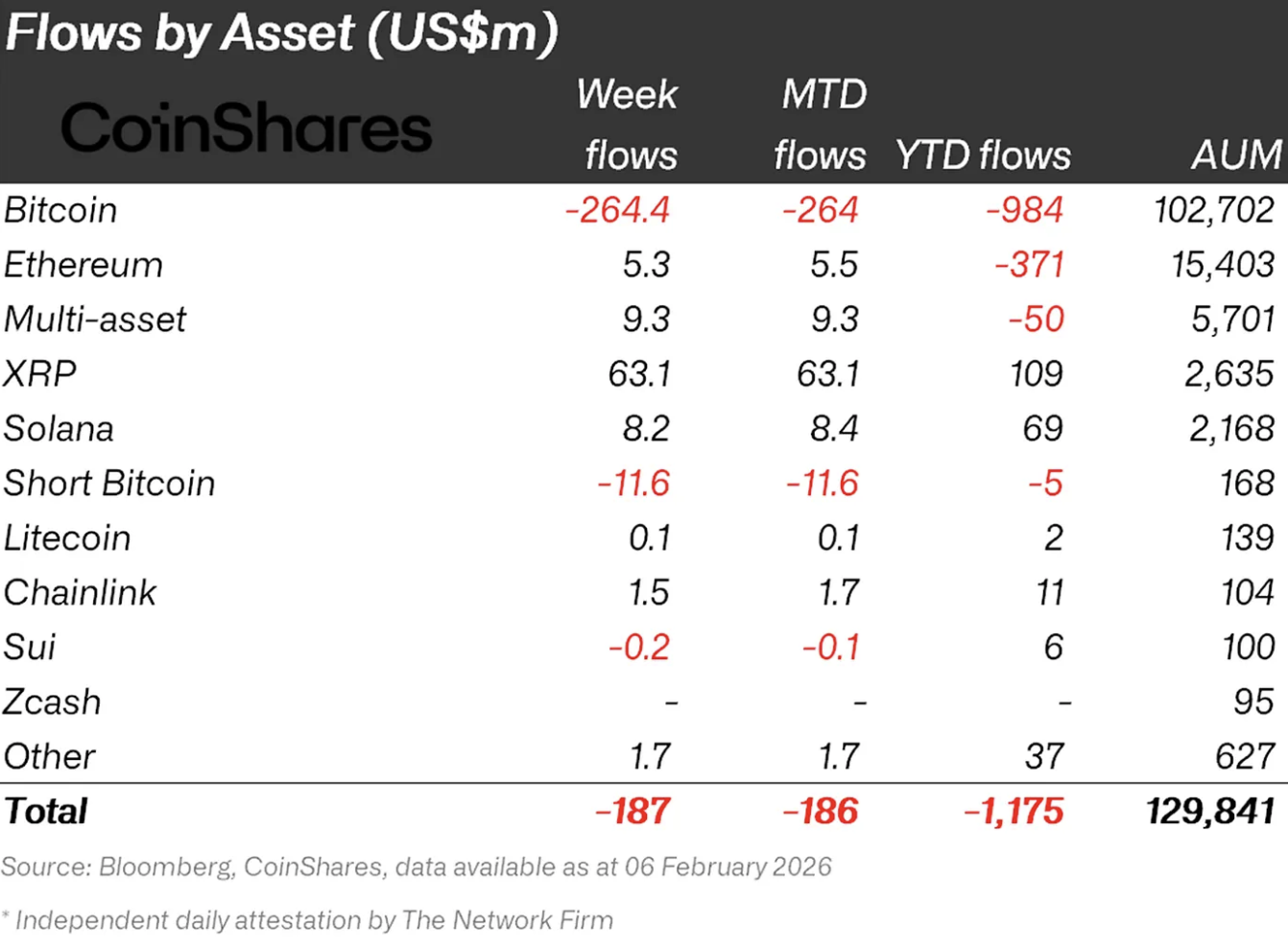 At the asset level, Bitcoin remained the primary source of negative sentiment, posting $264.4 million in weekly outflows. Ethereum, by contrast, attracted modest inflows of $5.3 million, while Solana added $8.2 million. XRP stood out as the strongest performer, recording $63.1 million in weekly inflows and maintaining its position as the top-performing digital asset year-to-date with $109 million in net inflows.