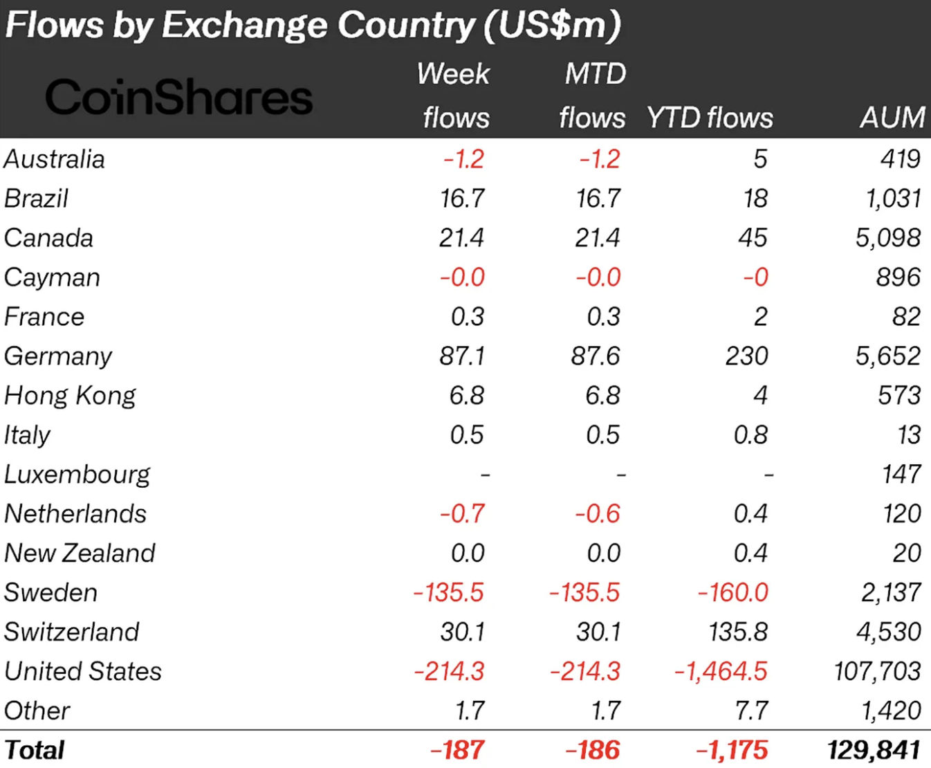 In contrast, the United States saw the largest weekly outflows at $214.3 million, reinforcing the current divergence between U.S. and European institutional positioning.