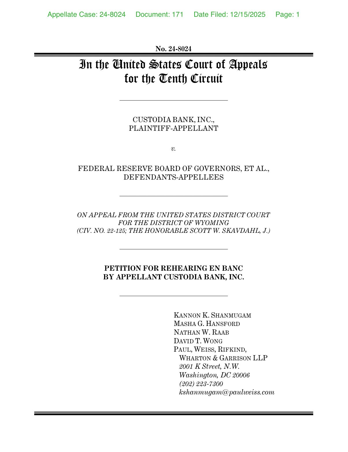 Wyoming-based crypto bank Custodia Bank has filed a petition for rehearing en banc, asking the full U.S. Court of Appeals for the Tenth Circuit to reconsider an earlier ruling that sided with the Federal Reserve in denying Custodia access to a master account.