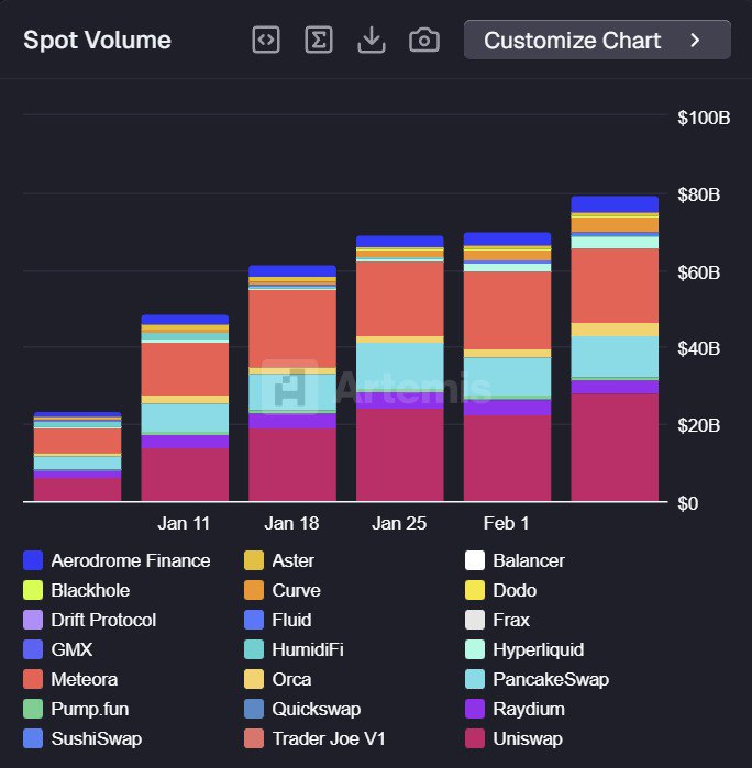 The latest data shows aggregate DeFi spot volume climbing from roughly the low-$20 billion range in early January to nearly $80 billion by early February.