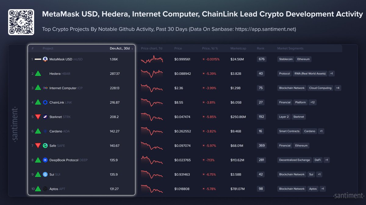 According to Santiment, MetaMask USD (mUSD) leads all crypto projects in notable GitHub development activity over the last month, significantly outpacing the rest of the field. The ranking tracks meaningful code contributions rather than superficial updates, providing a clearer signal of sustained development momentum.