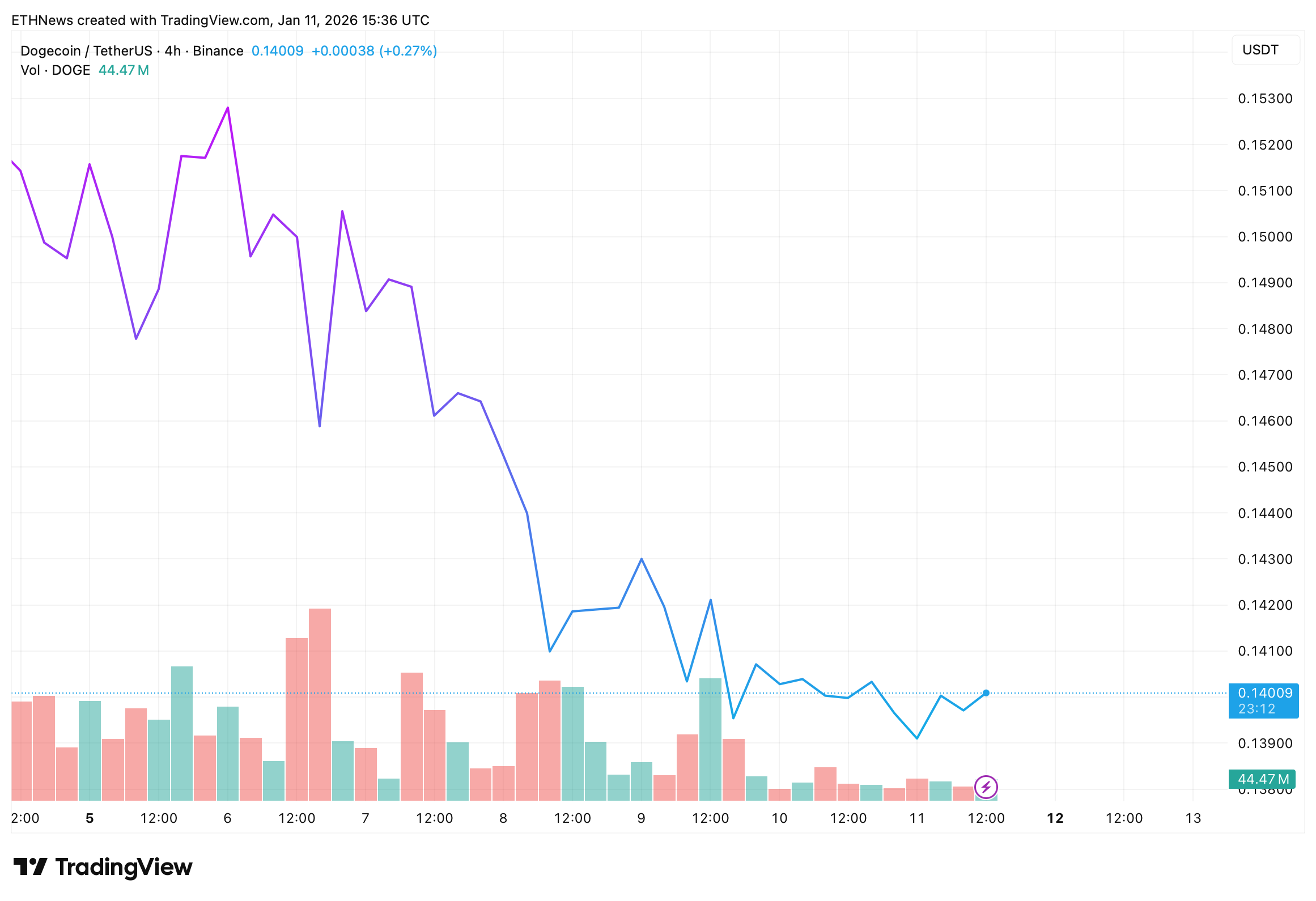 The TradingView chart shows Dogecoin trading around $0.1400 on the 4-hour timeframe. Recent candles indicate price stabilization following the trendline break, rather than an aggressive continuation move. Trading volume appears moderate, with no major spike accompanying the breakout, implying that the move is currently driven by technical positioning rather than strong momentum inflows.
