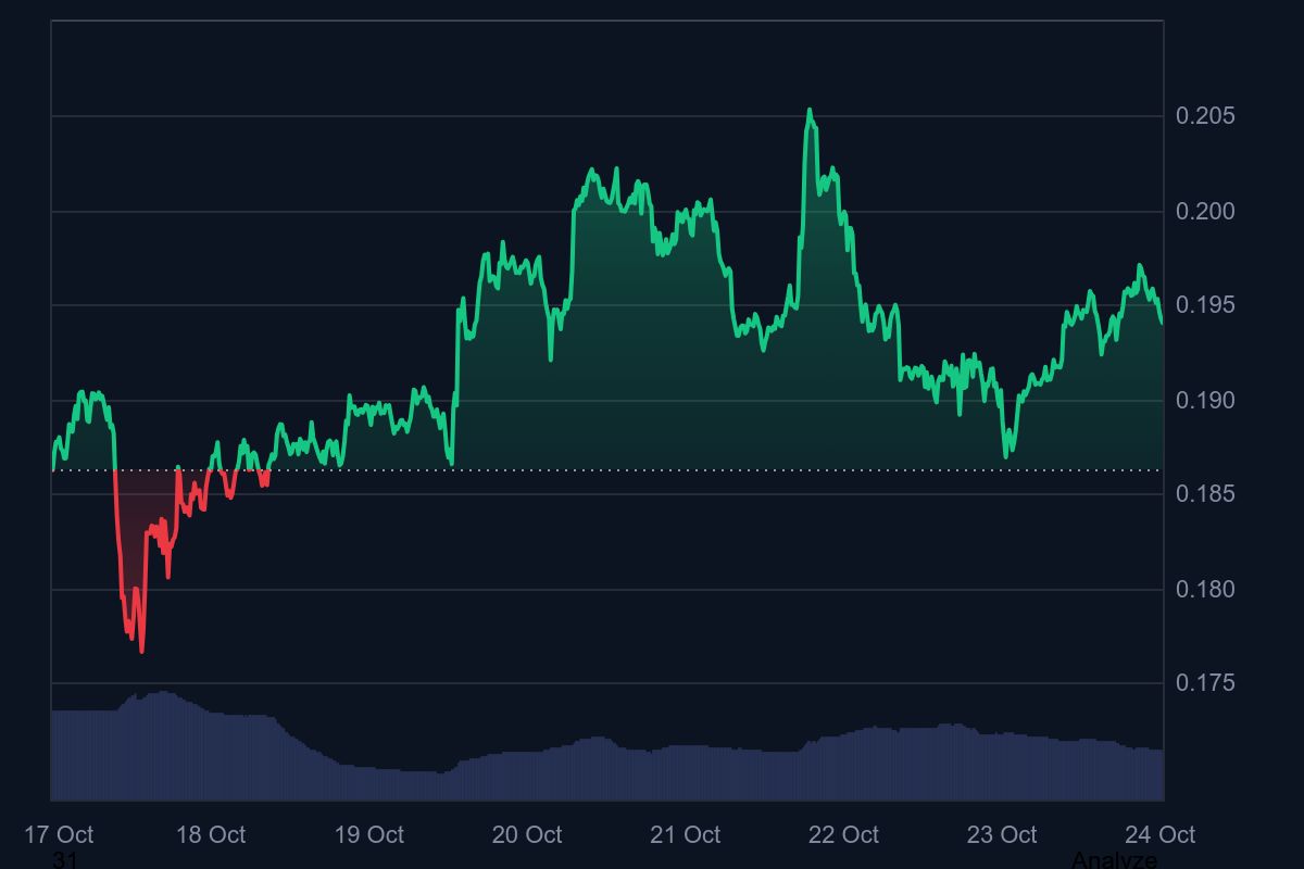 DOGE is trading around $0.194, up nearly 4% over the past week, with a market capitalization of $29.4 billion, according to CoinMarketCap. The memecoin saw an initial recovery after a market-wide flush, but price action has since stabilized between $0.1778 (support) and $0.2181 (resistance).