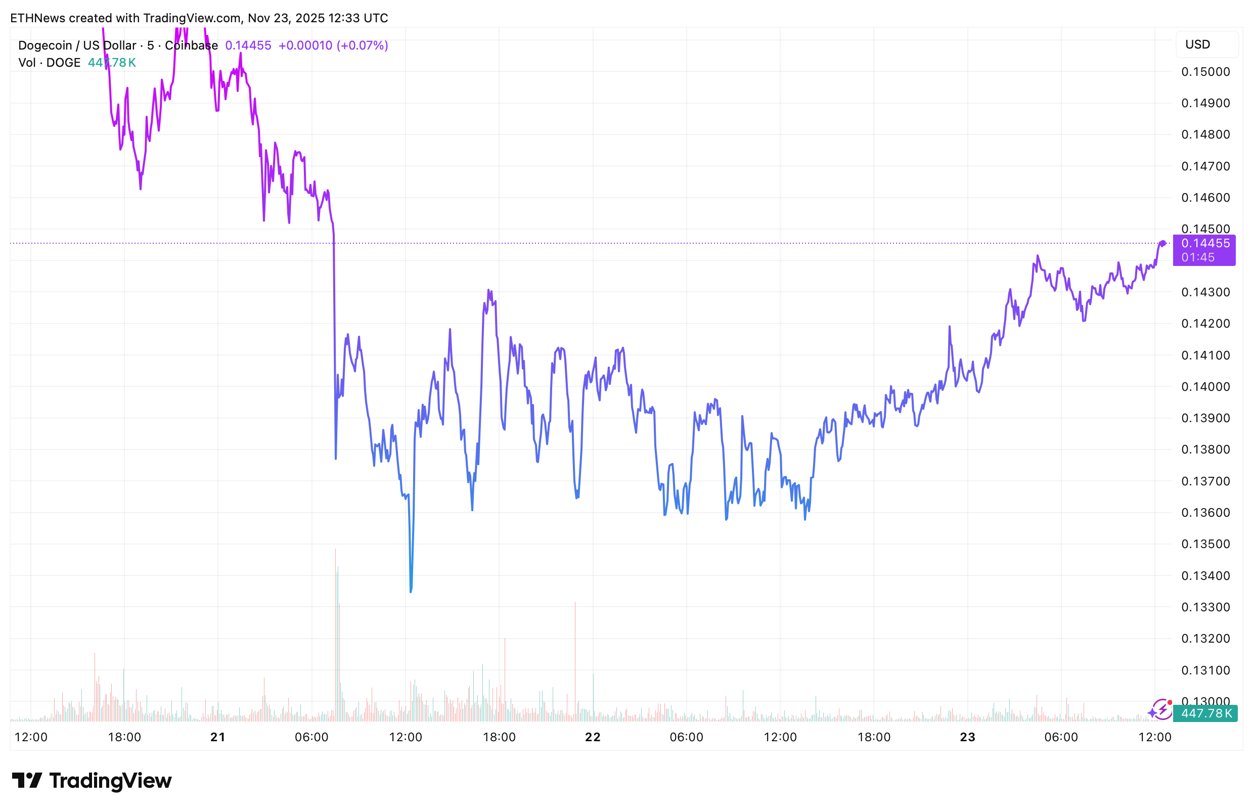 Despite the cautious environment, the short-term chart on TradingView shows a steady intraday rebound from the $0.136–$0.138 range, an area that has historically offered support.