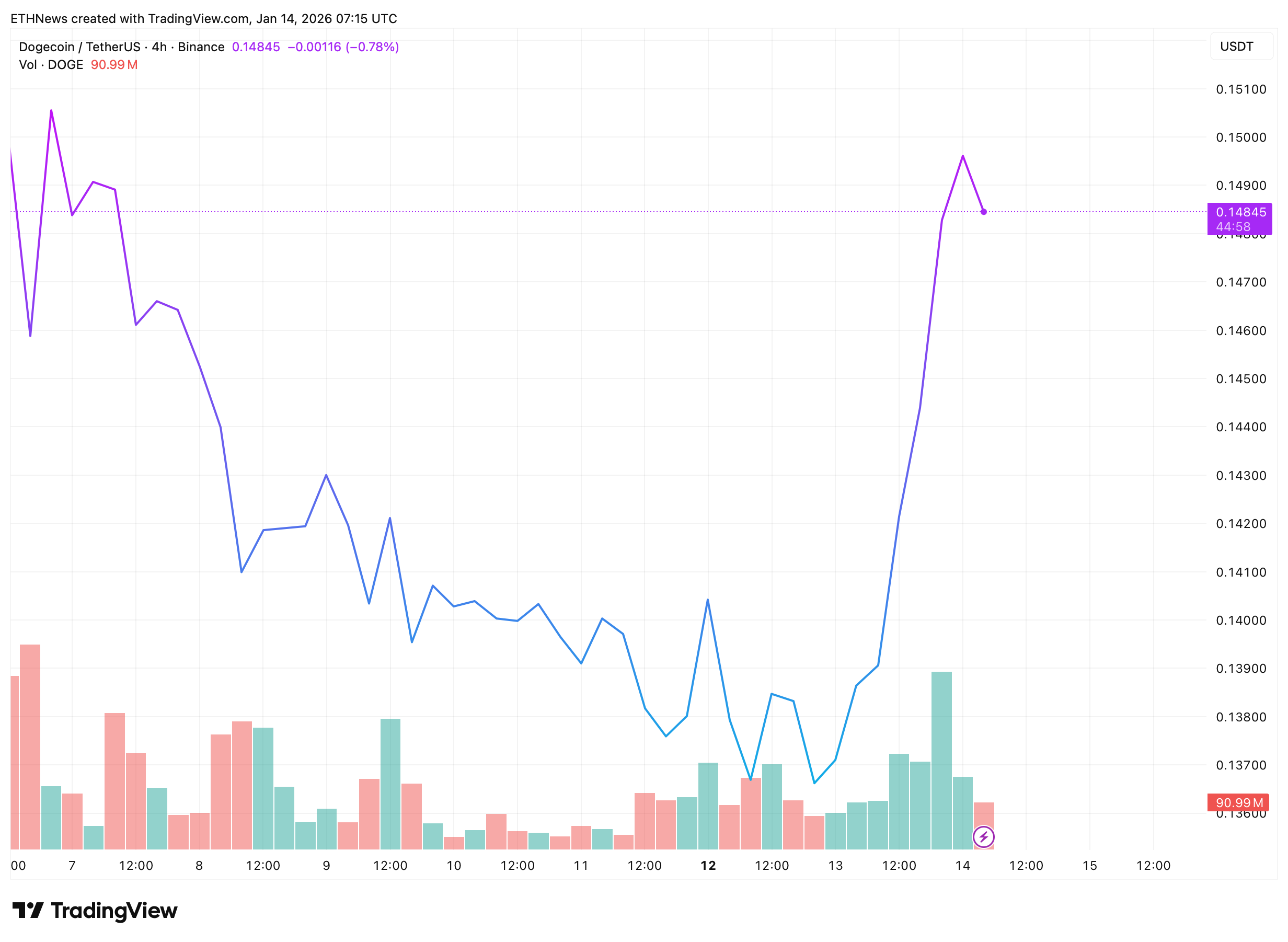 Dogecoin (DOGE) staged a strong rebound over the past 24 hours, surging from a local low near $0.1367 to an intraday peak just below $0.150, according to the latest 4-hour chart.