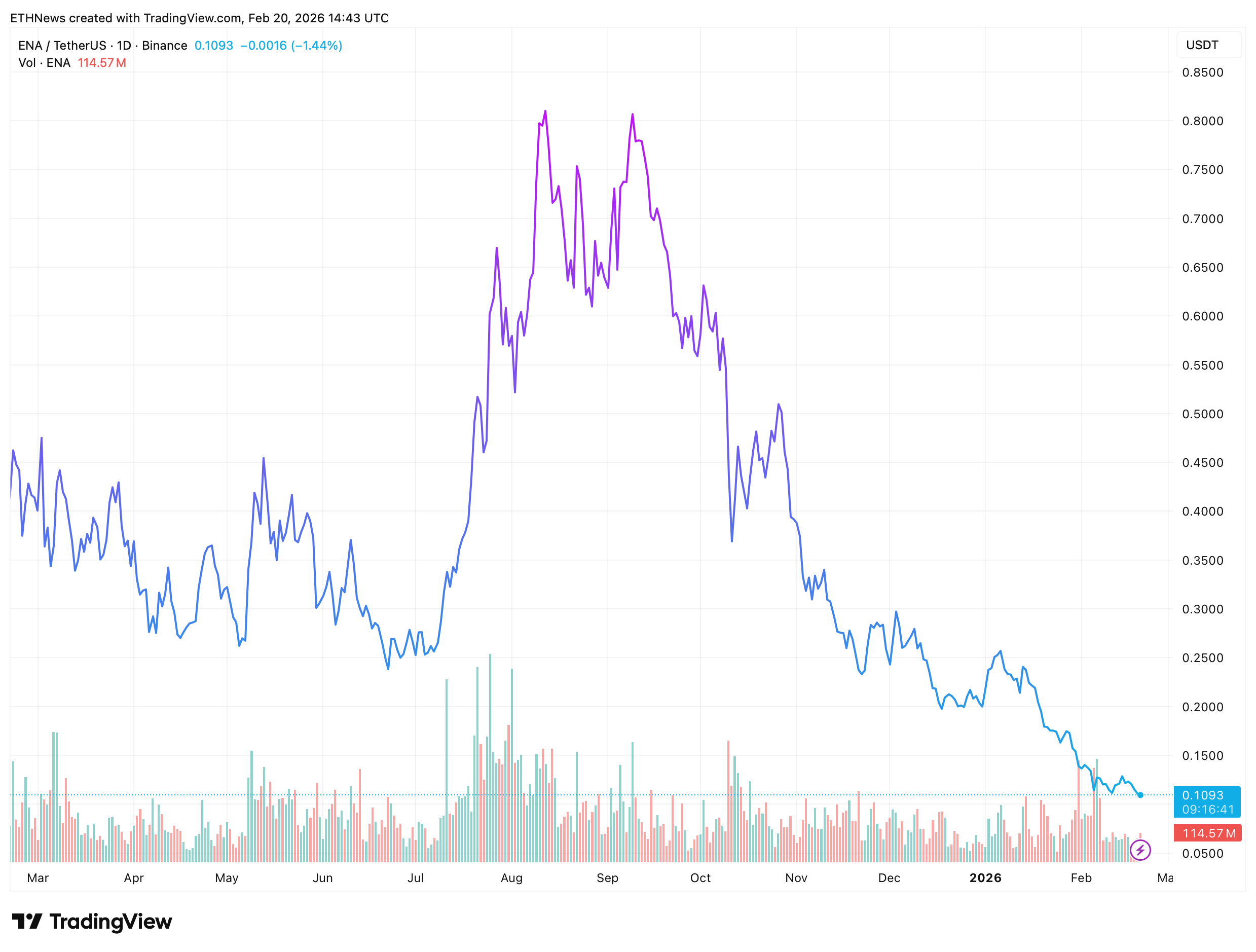 The latest chart shows a clear macro downtrend, with ENA declining steadily from the $0.75–$0.80 range in September toward its current levels near $0.11. Volume spiked during several waves of selling pressure, particularly in late 2025 and early February 2026, confirming strong distribution phases.