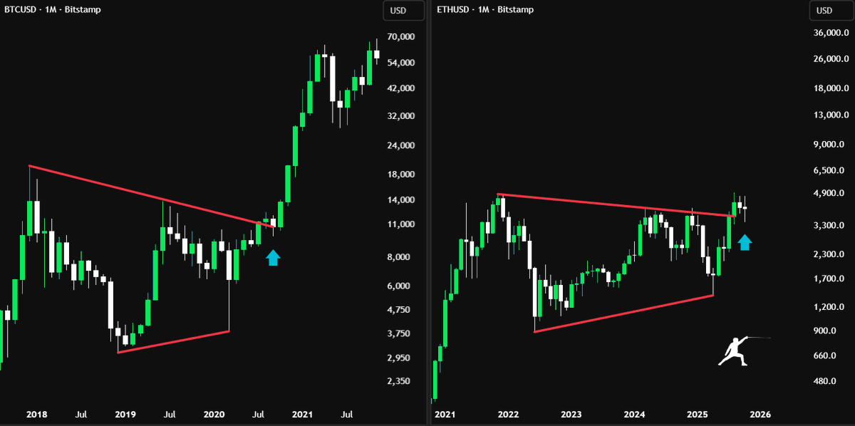 Meanwhile, fellow analyst Rekt Fencer sees an even bigger picture. He noted that Ethereum’s current structure mirrors Bitcoin’s 2020–2021 breakout, which preceded BTC’s run from $10,000 to nearly $70,000. By comparison, he argues, Ethereum could target $15,000 this cycle if the fractal repeats. “Don’t overthink it,” he wrote, underscoring his confidence in the macro pattern.
