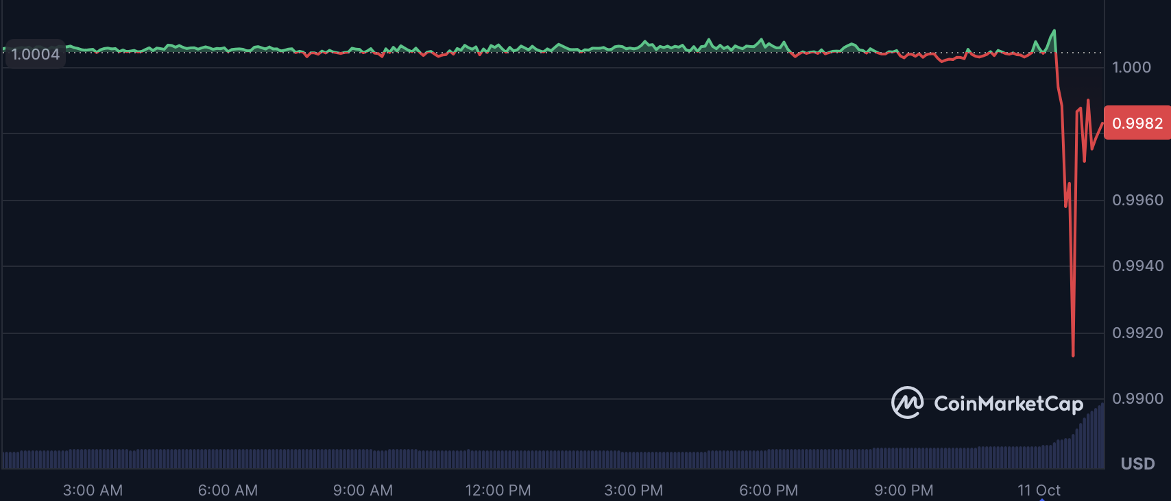 The incident was triggered by President Donald Trump’s announcement of a 100% tariff on Chinese imports, which sent shockwaves through global financial markets. In the hours that followed, digital assets experienced record liquidations exceeding $19 billion, forcing widespread margin calls and liquidity drains. During this cascade, Ethena’s USDe briefly slipped to $0.992 according to data from CoinMarketCap, before quickly regaining its $1 peg as conditions stabilized.