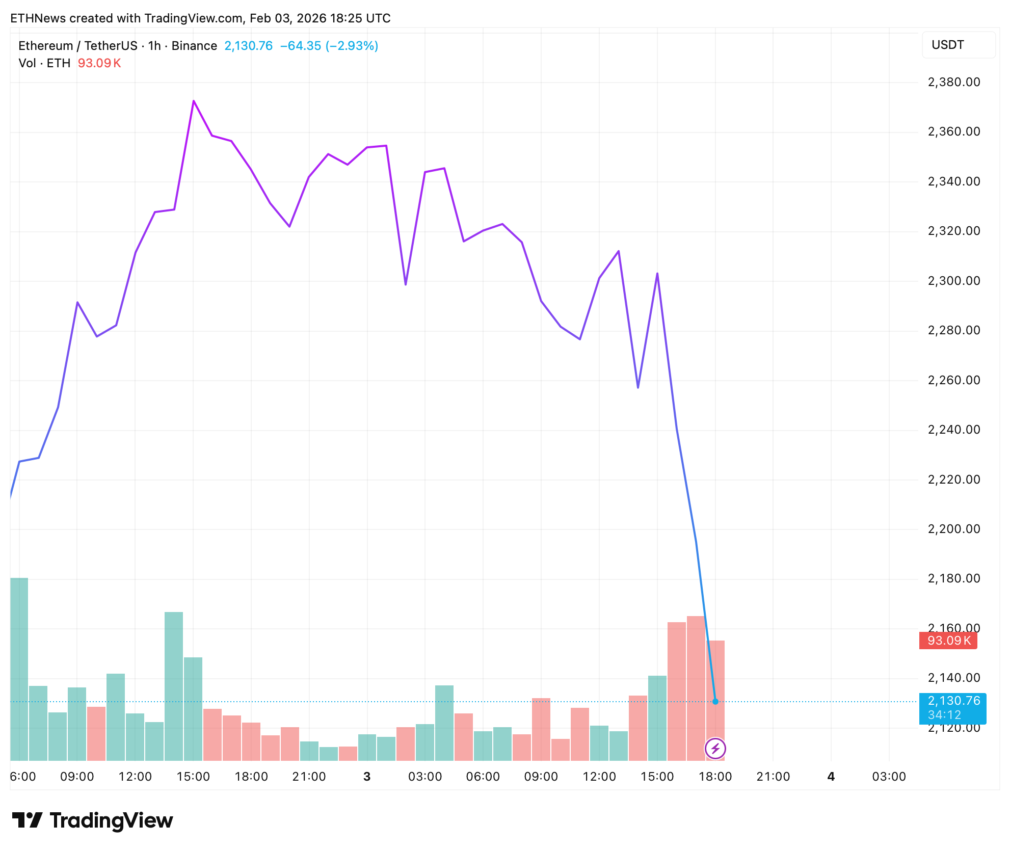 Ethereum is currently trading around $2,130, after a steep intraday drop accompanied by expanding red volume. The move reflects strong sell-side participation rather than a slow drift lower, indicating urgency behind the decline.